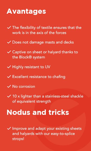 - Captive on sheet or halyard thanks to the Block® system